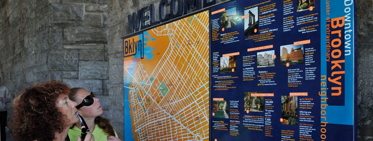 Summer 2009. Downtown Brooklyn Map and neighborhood descriptions designed at Two Twelve Associates are an integral part of a sign program awarded an SEGD Merit Award. The sign program was developed for the Dumbo Improvement District in Brooklyn, New York.