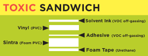 Speaking on the Society for Environmental Graphic Design's webinar panel on sustainability as a process for focusing on its true value—doing more with less, and using less more efficiently, I shared some of the strategies I've developed for design teams interested in paring down; saving material and cost. "Toxic Sandwich" is a diagram (shown above) I developed to illustrate how material layers can be less toxic and less in number.