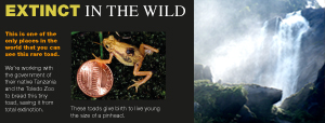 Winter 2010. An interpretive exhibit on the Wildlife Conservation Society's rescue of nearly extinct Tanzanian Kihansi Spray Toads now resides in the Reptile House at the Bronx Zoo.
